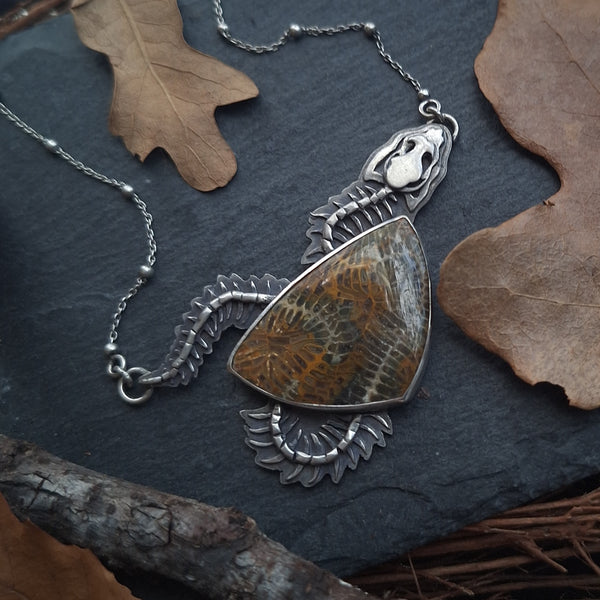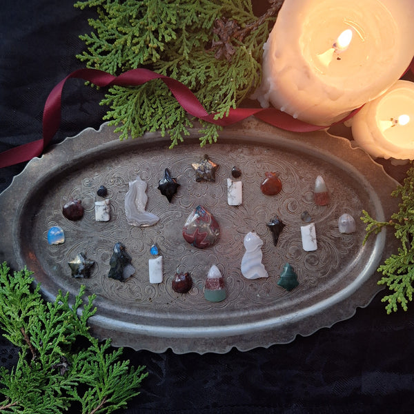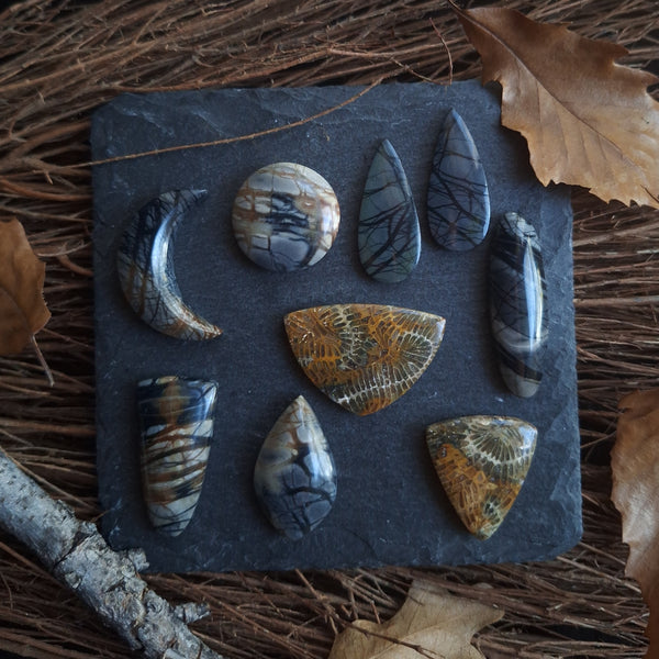 This mini collection celebrates this liminal time with stones holding patterns reminiscent of bare tree branches, darkened skies, and bones laying amongst the fallen leaves.