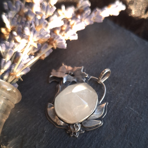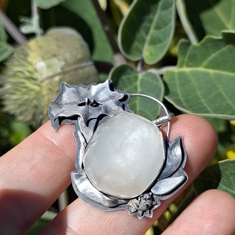 This pendant features a large icy white topaz with soft internal shimmers - it is so hard to capture the play of light inside this stone on camera. Around the stone rest a dimensional flower, leaves, a spiky seed pod, and an unopened bloom. The backside is adorned with a crescent moon made of jeweler's brass and is stamped with my maker's mark. All of the silver has been oxidized, a process which creates the blackened or antiqued appearance on silver. The raised points have been polished to shine, while the low points retain the oxidized color to show off the depth and details. This pendant measures approximately 1.25" tall and 0.75" wide. All metal used in this piece is sterling silver, with the exception of the brass moon.