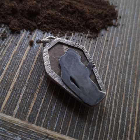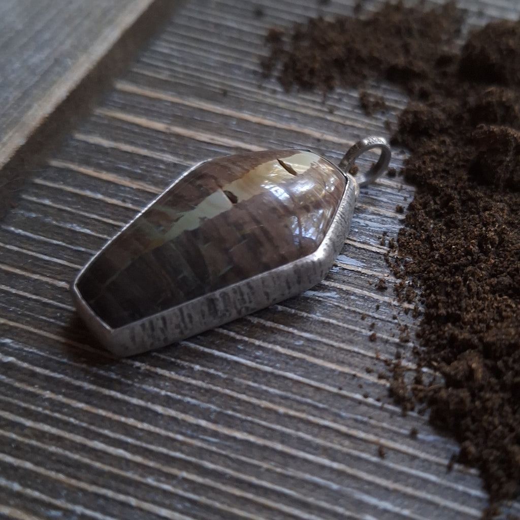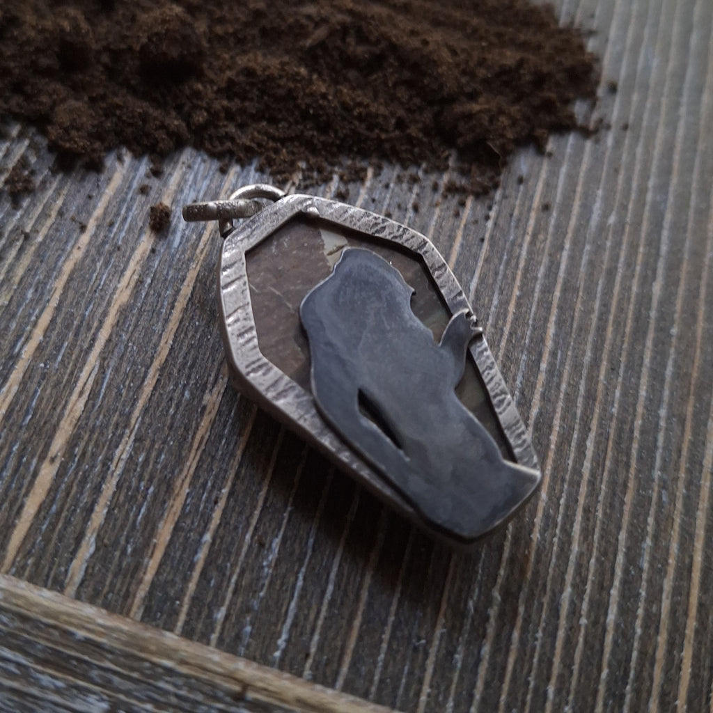 The coffin is carved from a very unique petrified wood with blue jasper veins formed in gaps in the wood. The silver bezel holding the stone and the edges of the backplate have been given a texture to mimic wood grain, matching the petrified wood grain in the coffin. On the backside, Count Orlock's iconic shadow has been sawn from silver sheet and oxidized to recreate the iconic shadow scene from the film. The pendant measures approximately 2" tall and 0.8" wide at the widest point. The raised points have been polished to shine, while the low points retain the oxidized color to show off the depth and details. All metal used in this piece is sterling silver.