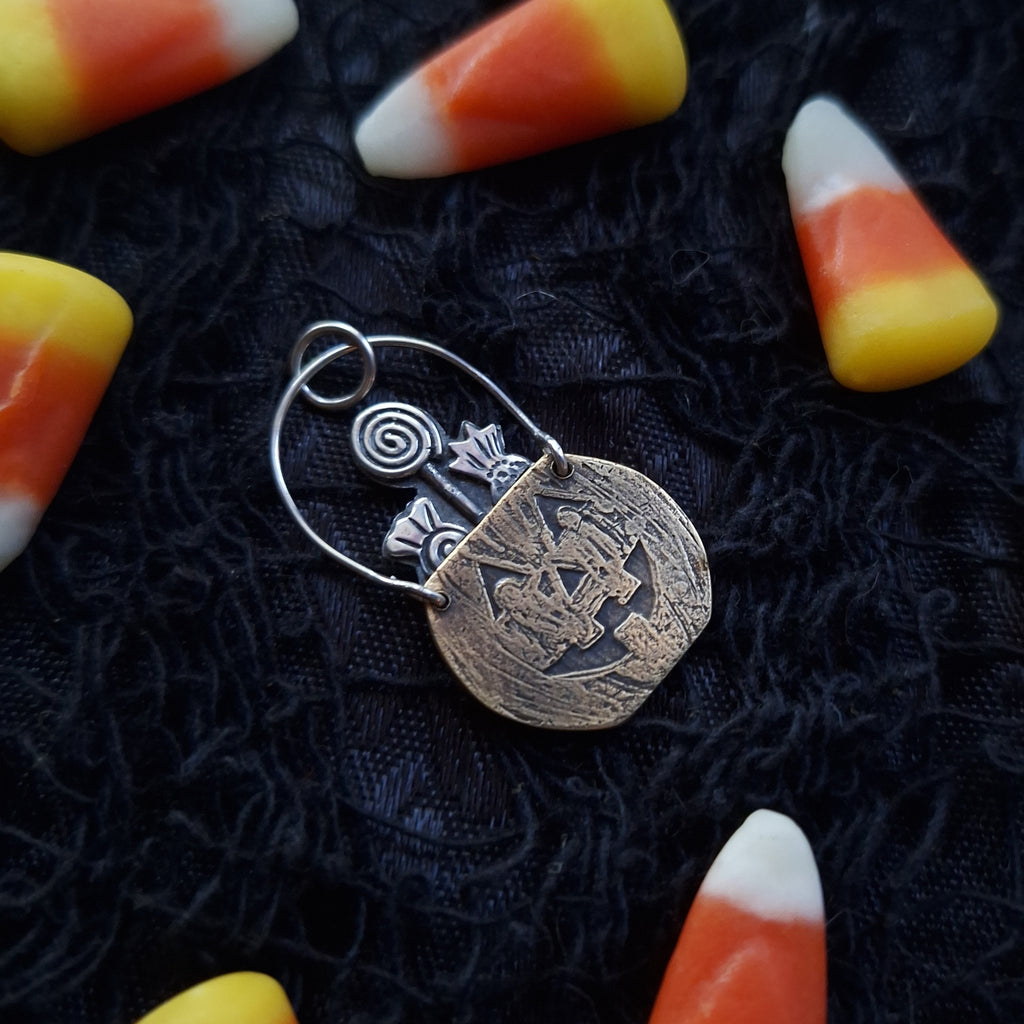 This little pendant has a brass bucket with etched texture and jack-o-lantern grin. It's full of sugary trick-or-treat treasures, with two wrapped candies and one lollipop spilling out of the top. The backside is stamped with swirls and tiny candies, as well as my maker's mark (BLJ). The handle is kinetic, allowing the bucket's handle to move and swing a bit with movement. All of the silver and brass have been oxidized, a process which creates the blackened or antiqued appearance on the metals. The raised points have been polished to shine, while the low points retain the oxidized color to show off the depth and details. All metal used in this piece is sterling silver, with the exception of the bronze pumpkin face.