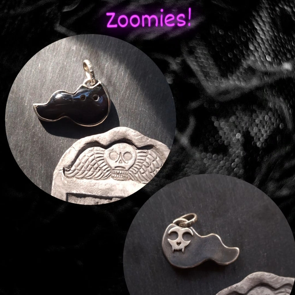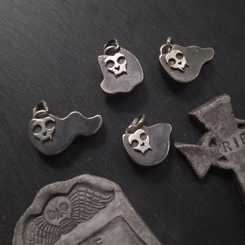 Set into sterling silver, these kitties are cut from a ghostly purple velvet obsidian. The stones appear black in low light, but have gorgeous purple flashes in bright light! The backside of each kitty is adorned with a tiny cat skull. All metal used in these pieces is sterling silver.