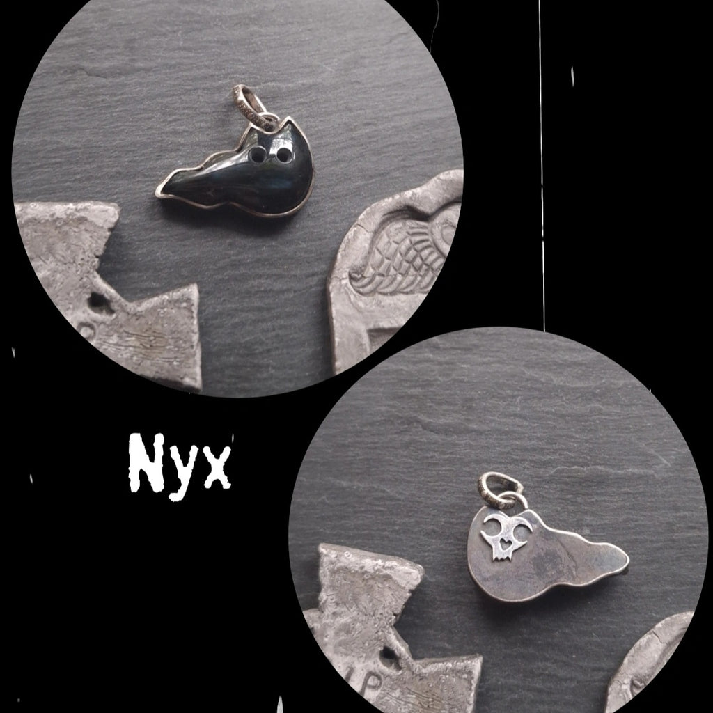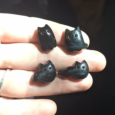 Set into sterling silver, these kitties are cut from a blue velvet obsidian, a black stone with eerie blue shifting in direct light! The backside of each kitty is adorned with a tiny cat skull. All metal used in these pieces is sterling silver.