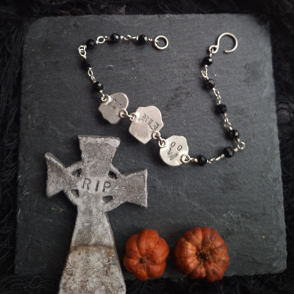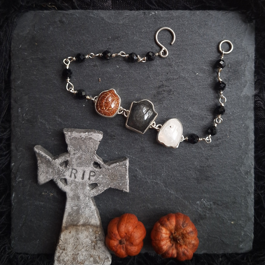 A cute scene of tiny stones: a goldstone pumpkin, a silversheen obsidian gravestone, and a ghost seam agate pumpkin! The sheen in the gravestone is absolutely gorgeous, while the sparkles in the pumpkin are quite eye-catching; the ghost is subtle, yet adorable. The chain is created from faceted black spinel stones wrapped by hand in sterling silver wire and is finished with a hook clasp. The backside of the gravestone is stamped with my maker's mark (BLJ), while the backside of the ghost and the pumpkin have been given tiny faces. All metal used in this piece is sterling silver.