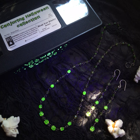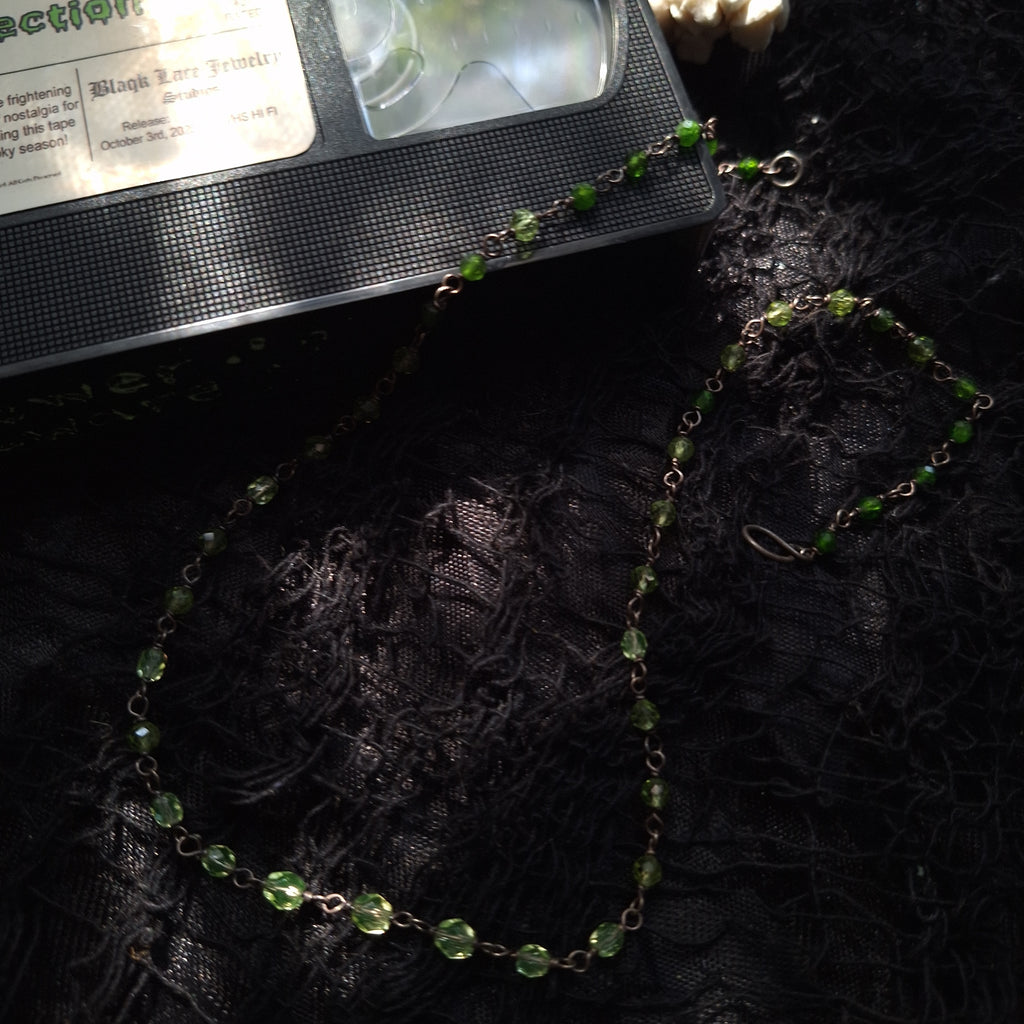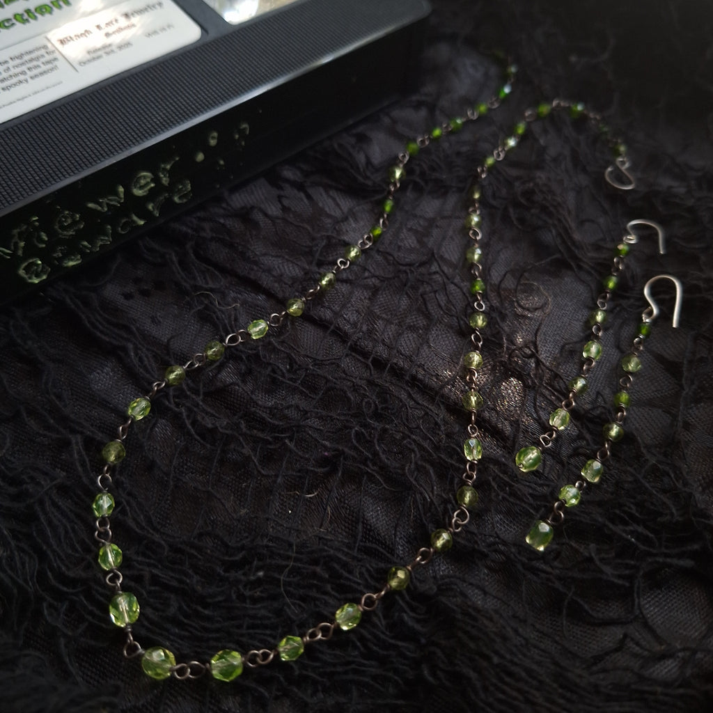 Each bead is carefully placed to create the illusion of dripping green slime. Starting with the darker chrome diopside towards the ends, transitioning into the bright green of the peridot, and finally into those lime green uranium glass beads, ending in the middle with slightly larger uranium glass beads were the 'slime' has pooled. The chain is finished with a handmade hook clasp. The silver has been oxidized, a process which creates the blackened or antiqued appearance on silver. The raised points have been polished to shine, while the low points retain the oxidized color to show off the depth and details. All metal used in this piece is sterling silver.