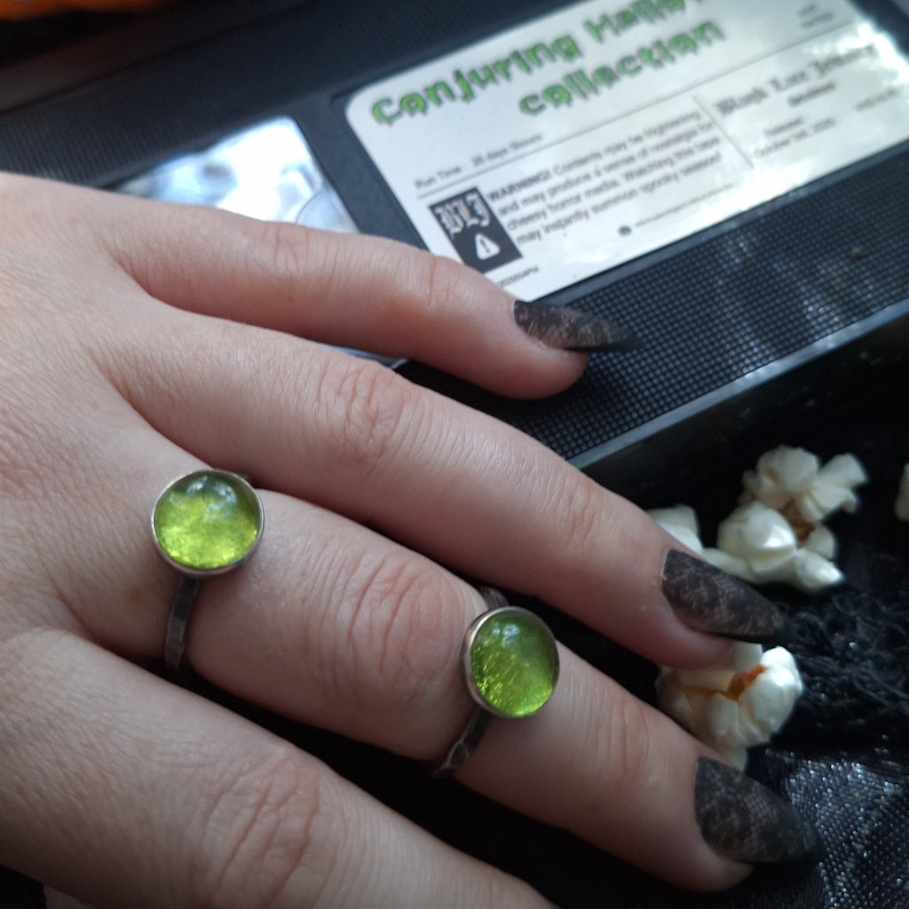 These eerie, vivid lime green stones are amber! Specifically, natural Caribbean amber that has then been heat and pressure treated to cause this vibrant green within the material. When light enters the high domes of the stones, the whole stone seems illuminated! Each stone is set into a band of heavily hammered sterling silver. All of the silver has been oxidized, a process which creates the blackened or antiqued appearance on silver. All metal in this ring is sterling silver.