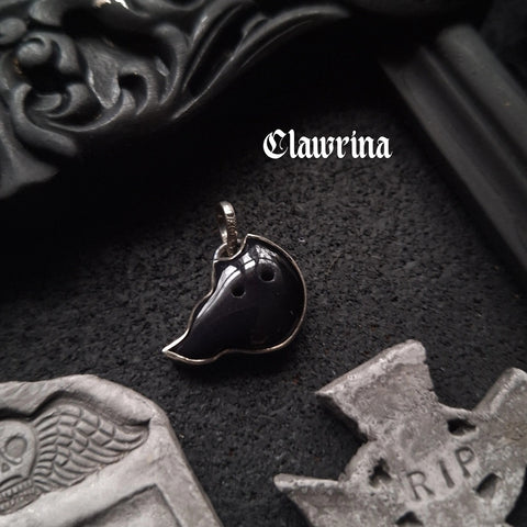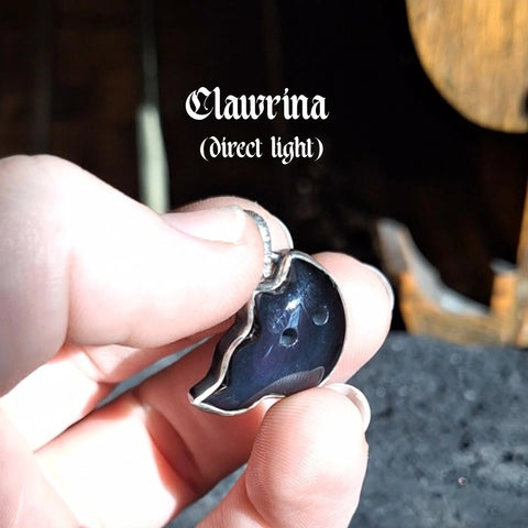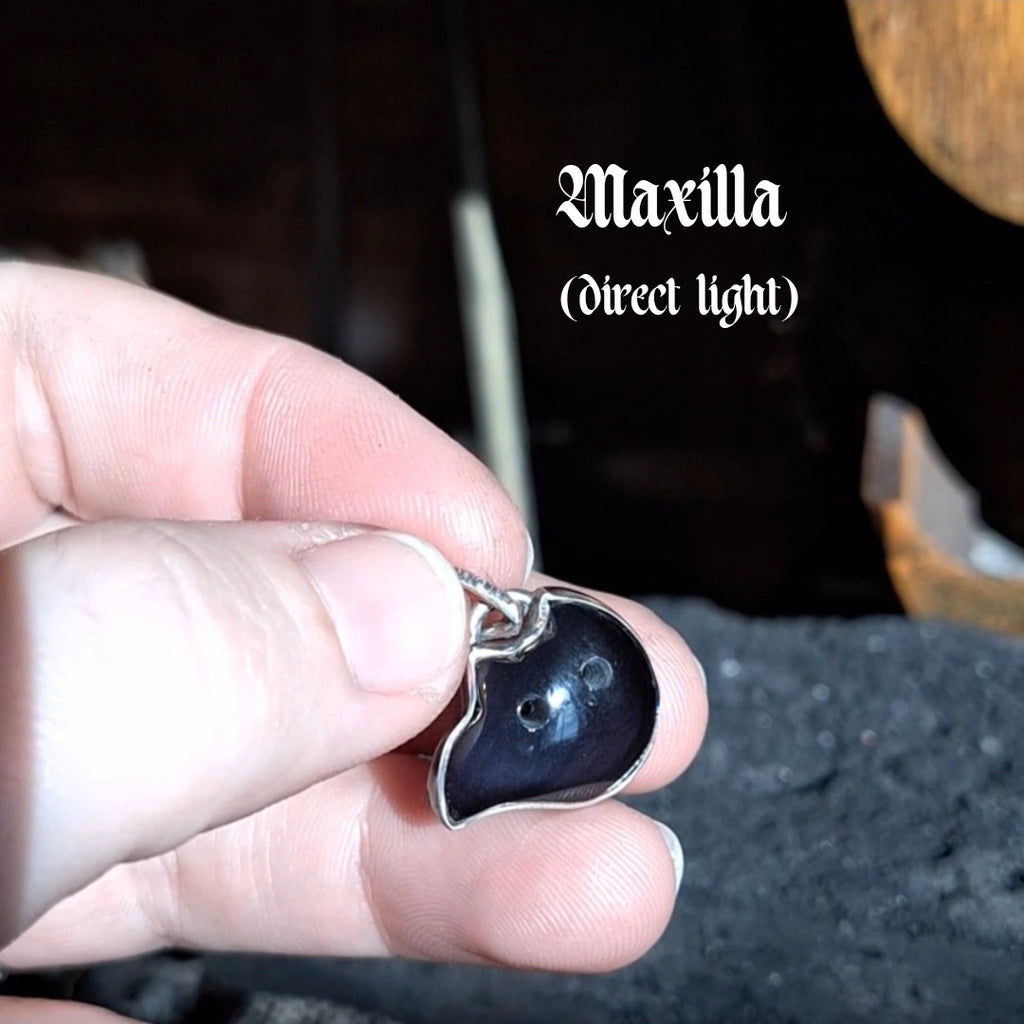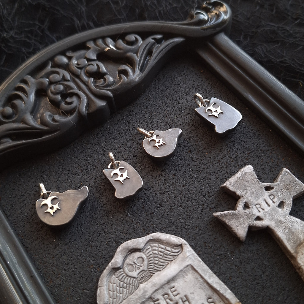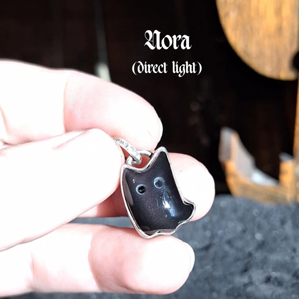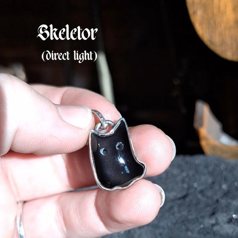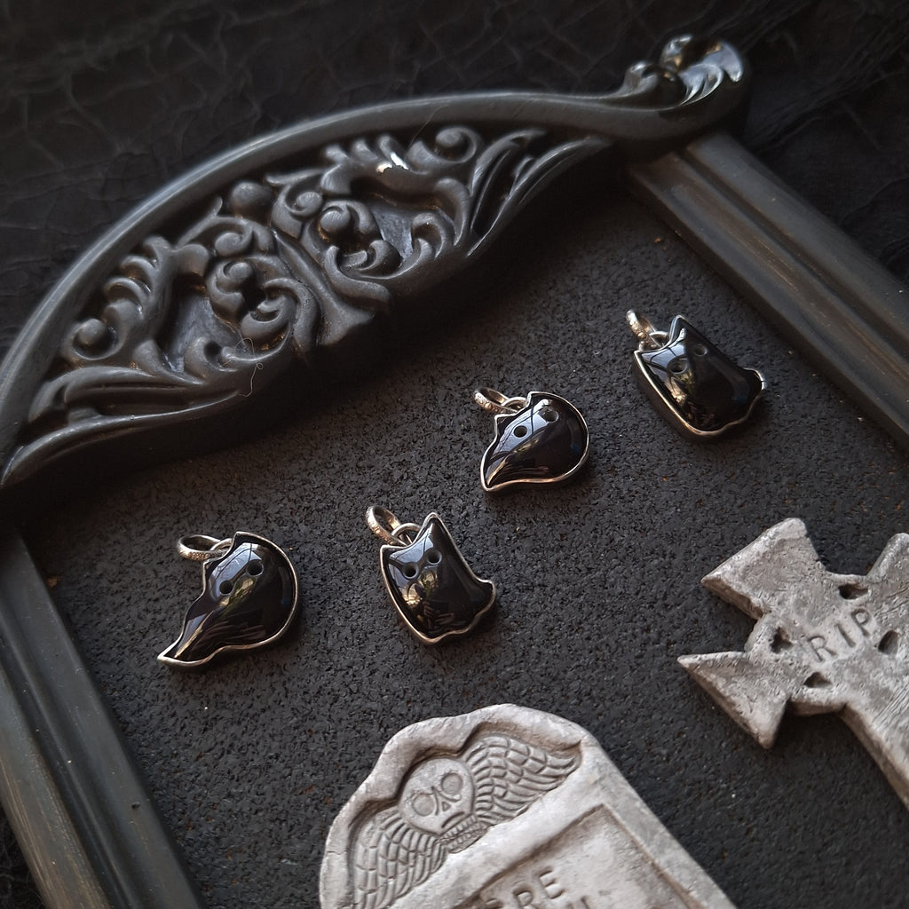 Set into sterling silver, these kitties are cut from a ghostly purple velvet obsidian. The stones appear black in low light, but have gorgeous purple flashes in bright light! The backside of each kitty is adorned with a tiny cat skull. All metal used in these pieces is sterling silver.