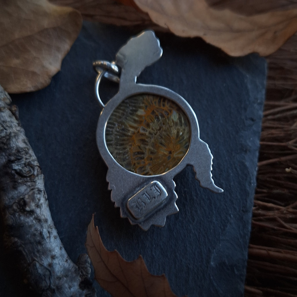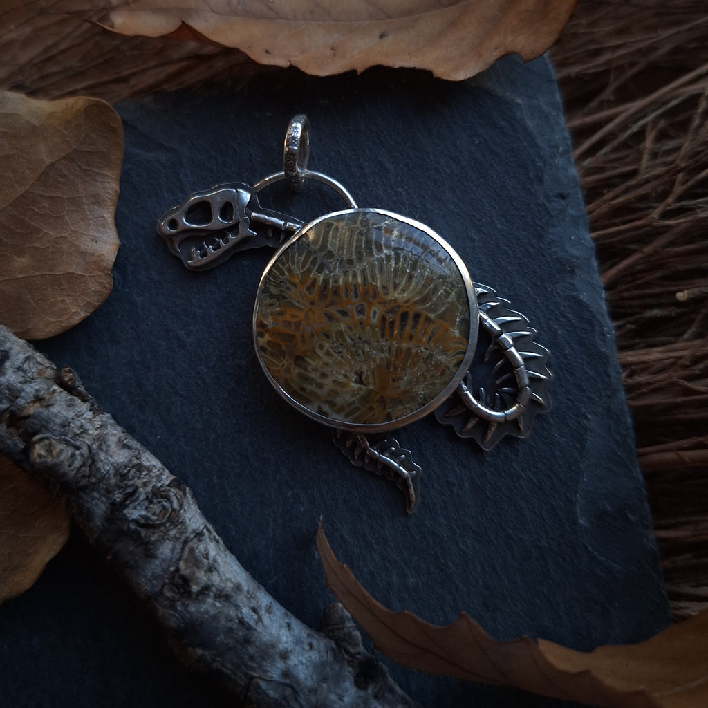 The stone in this pendant is an incredible fossilized coral, with the lines in these ancient polyps forming the appearance of snake vertebrae and ribs running through autumnal colored pockets. The stone has tiny sparkles in it as well. Tiny silver bones have been cut and shaped by hand to bring the rest of the snake skeleton into being. The backside has been cut away to reveal the polished backside of this unique stone, and is also stamped marked with my maker's mark (BLJ). The silver has been oxidized, a process which creates the blackened or antiqued appearance on silver. The raised points have been polished to shine, while the low points retain the oxidized color to show off the depth and details. The pendant measures 2" tall and 1" wide at the widest point. All metal used in this piece is sterling silver.