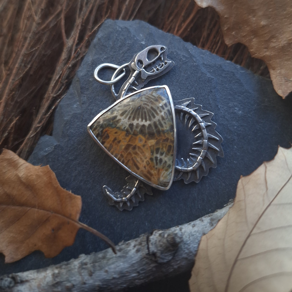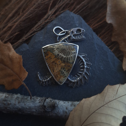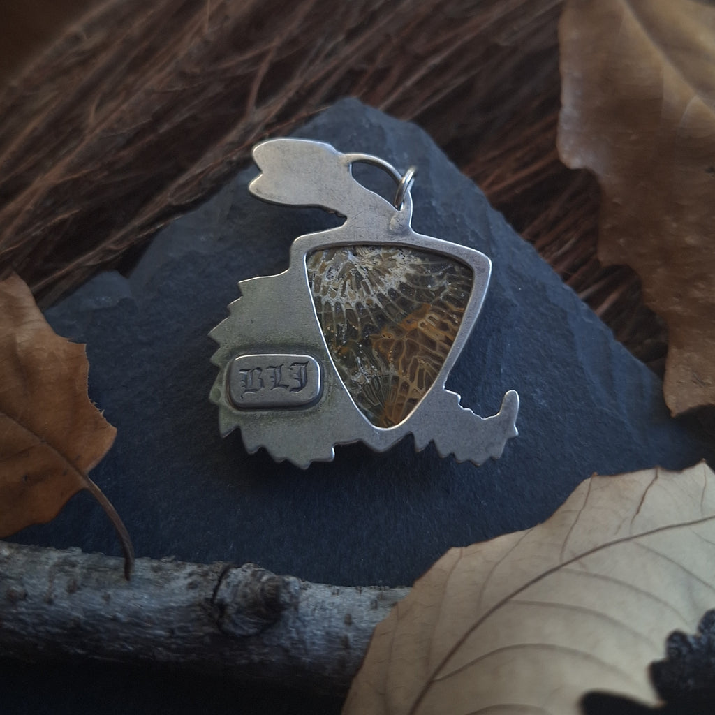 The stone in this pendant is an incredible fossilized coral, with the lines in these ancient polyps forming the appearance of snake vertebrae and ribs running through autumnal colored pockets. The stone has tiny sparkles in it as well. Tiny silver bones have been cut and shaped by hand to bring the rest of the snake skeleton into being. The backside has been cut away to reveal the polished backside of this unique stone, and is also stamped marked with my maker's mark (BLJ). The silver has been oxidized, a process which creates the blackened or antiqued appearance on silver. The raised points have been polished to shine, while the low points retain the oxidized color to show off the depth and details. The pendant measures 1.7" tall and 1.25" wide at the widest point. All metal used in this piece is sterling silver.