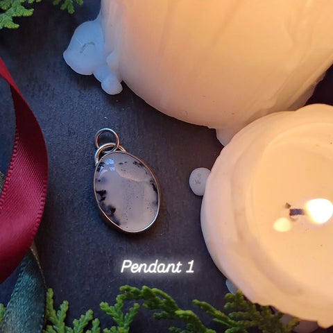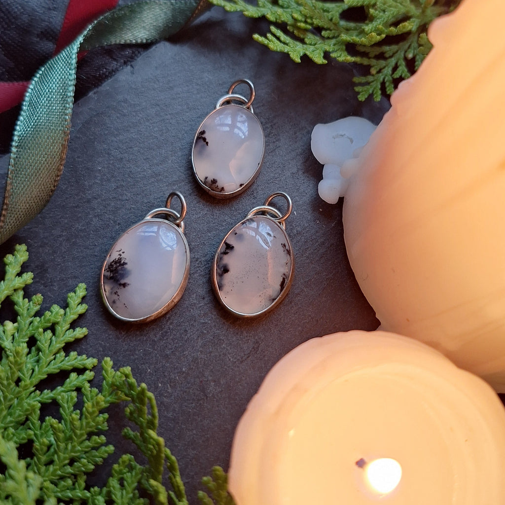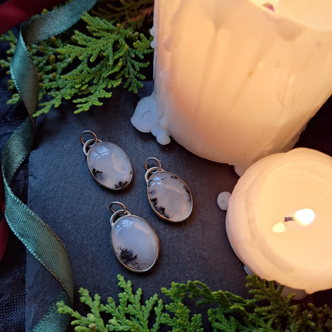 Each pendant features a snowy dendritic opal. The dendrites in each appear as trees in a wintery landscape. The backsides are stamped with snowflakes and are marked with my maker's mark (BLJ). The silver has been oxidized, a process which creates the blackened or antiqued appearance on silver. The raised points have been polished to shine, while the low points retain the oxidized color to show off the depth and details. Each pendant measures approximately 1" tall by 0.6" wide at the widest point. All metal used in these pendants is sterling silver.