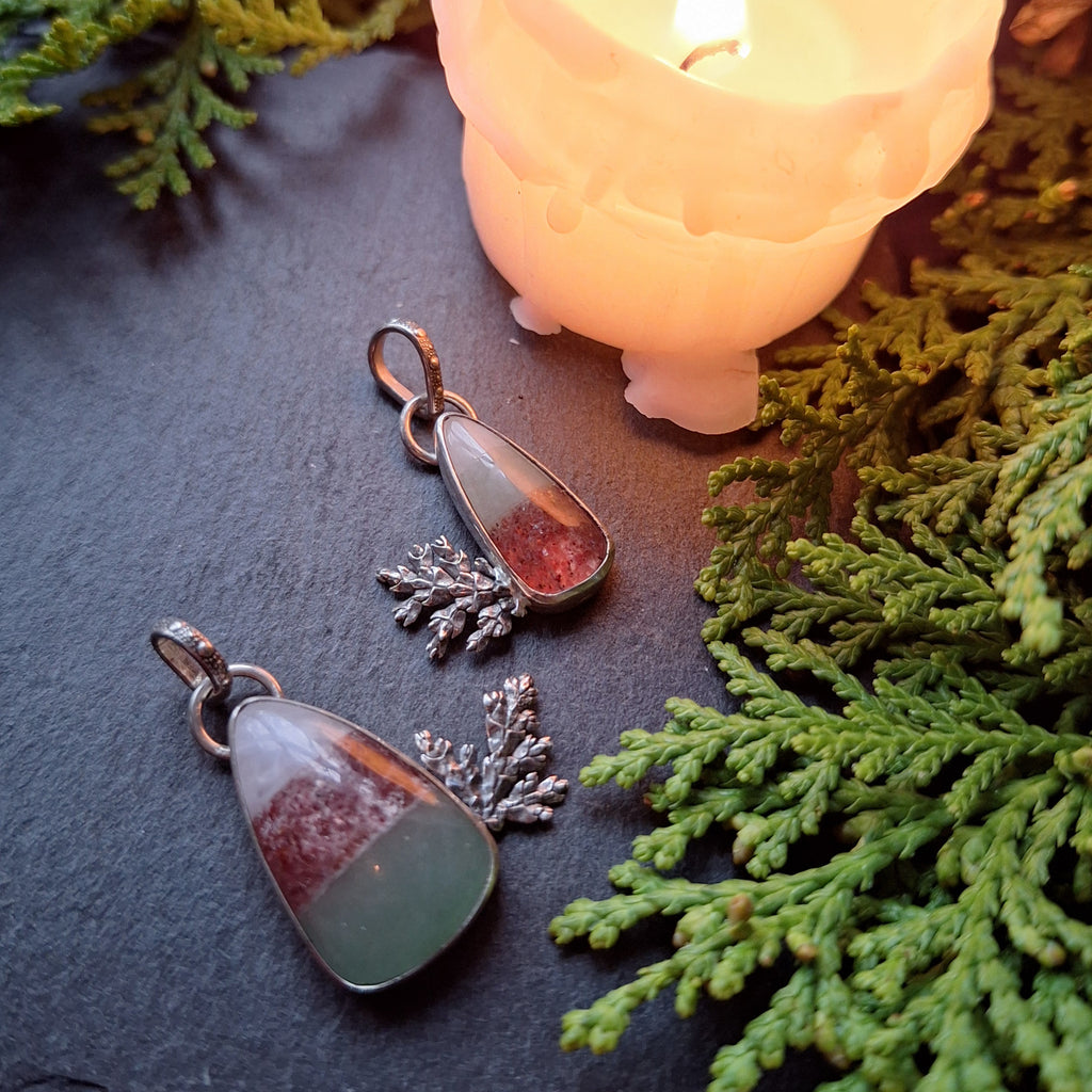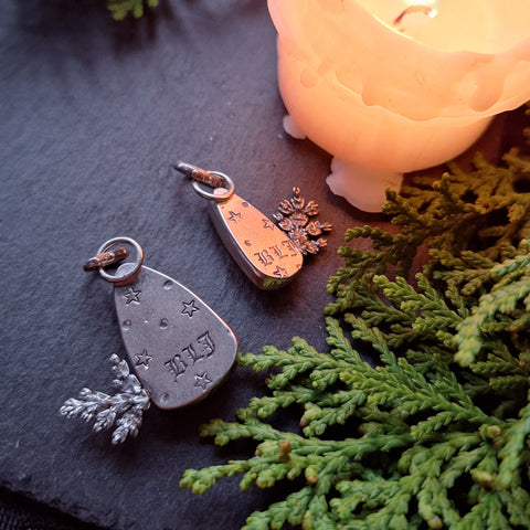 Each pendant features a special candy corn cut from natural stones in festive colors! These are adorned with bits of evergreen cast in sterling silver. The backsides are stamped with stars and are marked with my maker's mark (BLJ). The silver has been oxidized, a process which creates the blackened or antiqued appearance on silver. The raised points have been polished to shine, while the low points retain the oxidized color to show off the depth and details. All metal used in these pendants is sterling silver.